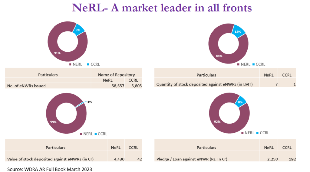 - NERL has issued more than 5.5 lakh eNWRs (Exchange + Emerging Business) for commodities over 59.70 Lakhs MT (Exchange + Emerging Business) deposited in registered warehouses of WDRA.