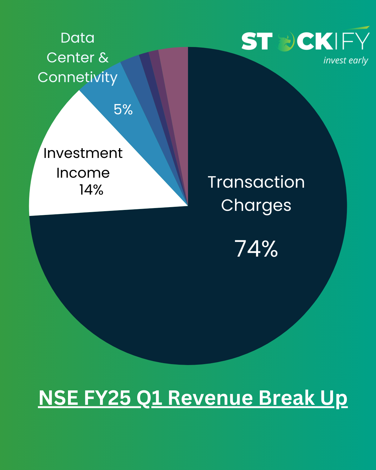 The total consolidated revenue comprises 74% from transaction charges, 14% from investment income, 5% from data center and connectivity charges, 2% from data services, and 1% each from listing and index services.